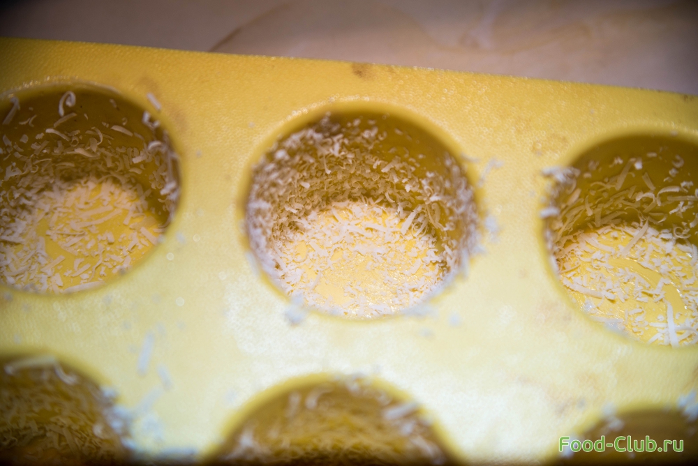 4. Смажьте форму для суфле маслом, затем посыпьте тертым сыром и распределите по всей поверхности формочек, чтобы сыр распределился по всей поверхности формочек.