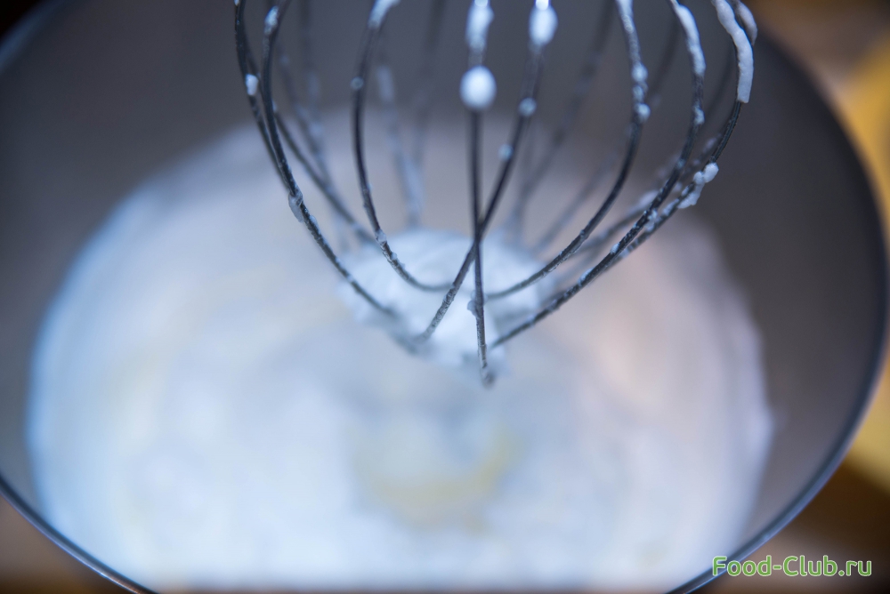 5. Белки взбейте с щепоткой соли до крепкой пены.