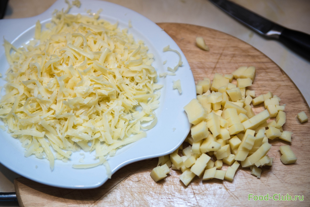 3. Половину сыра натрите на крупной терке, оставшуюся часть порежьте на средних размеров кубики.