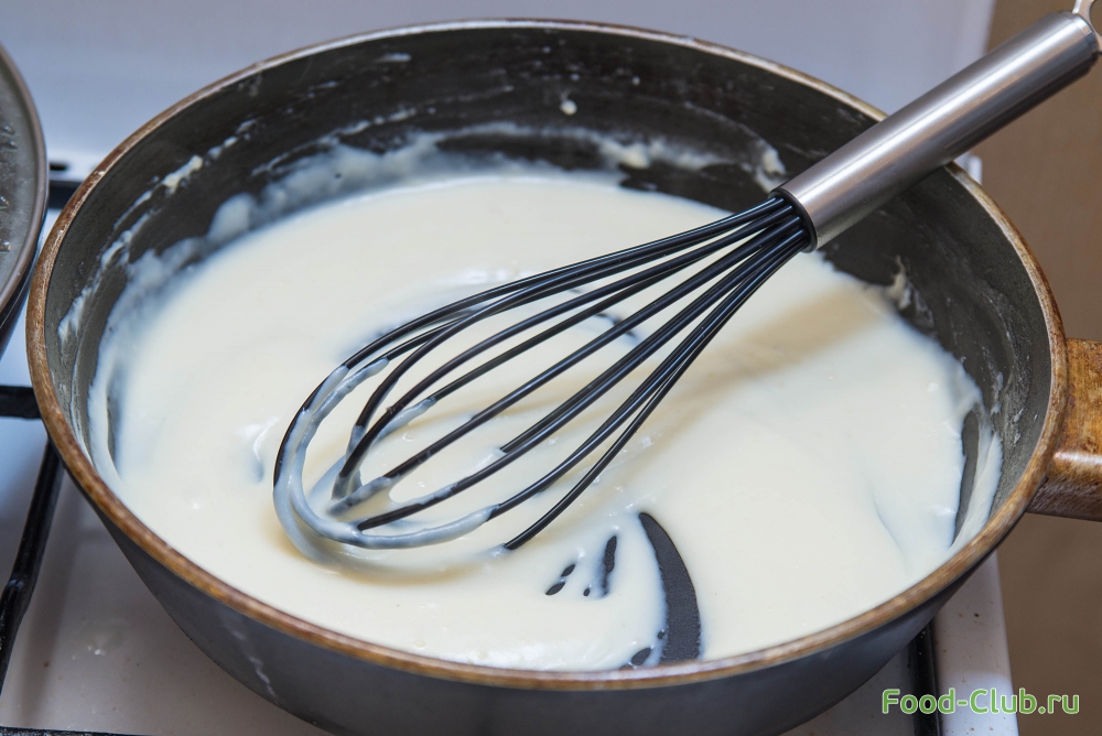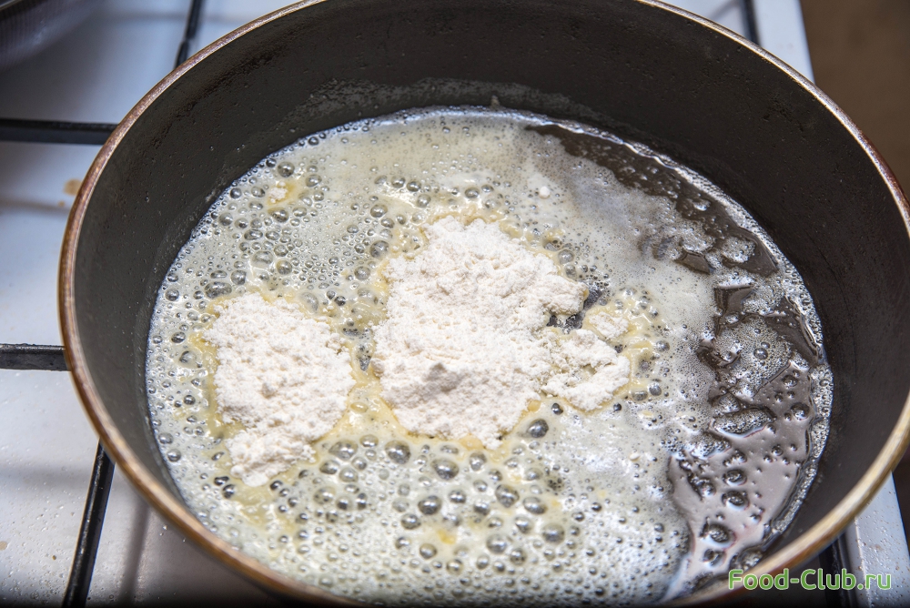 1. Для начала приготовим соус бешамель. Растопите сливочное масло в сковороде на умеренно среднем огне. Добавьте муку и обжарьте на слабом огне в течении 2 минут.