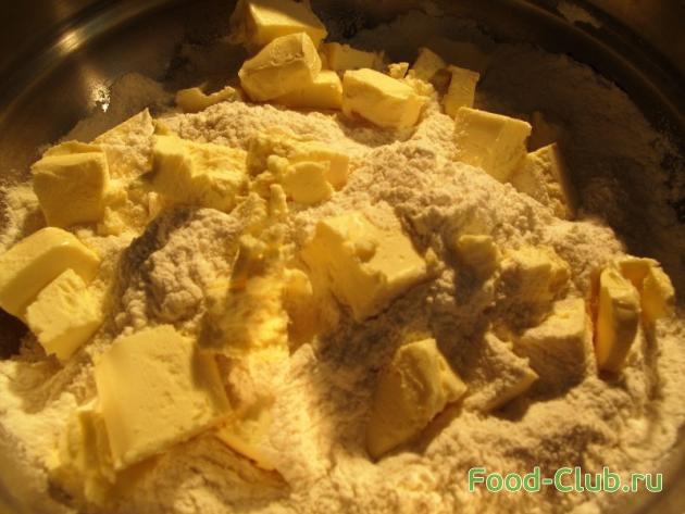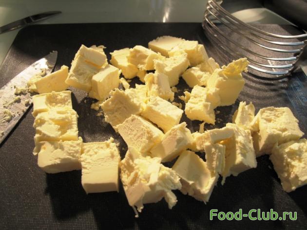 1. Все ингредиенты для теста должны быть холодными, поэтому предварительно ставим их на полчаса в холодильник. Масло нарезаем на крупные кусочки.