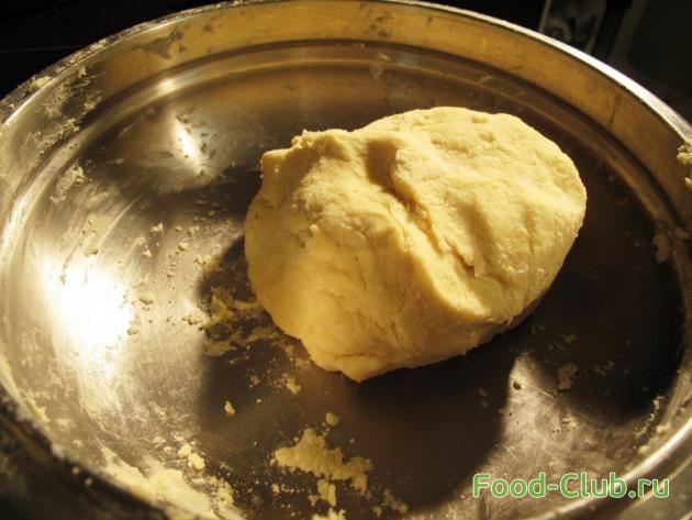 3. Руками вымешиваем тесто. Работать надо очень быстро, чтобы ингредиенты не успели нагреться. Постепенно добавляем воду, разминаем тесто и скатываем в шар. Не стоит переусердствовать, тесто с вкраплениями масла – то что необходимо.