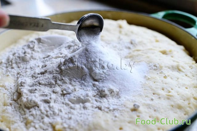 8. Через час к тесту добавляем дополнительно пол стакана муки, порошок для выпечки, соду и соль. Если тесто получается липким, то добавляем еще пол стакана муки и хорошо вымешиваем. Ставим готовое тесто на час в холодильник.