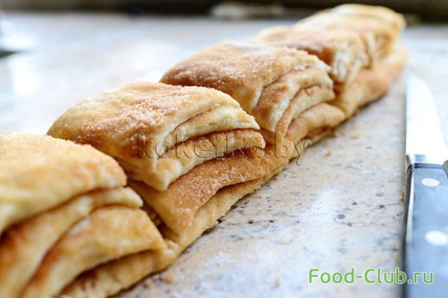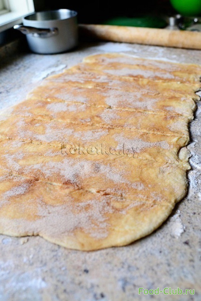 12. Получившейся смесью посыпаем тесто. Разрезаем пласт на 6-8 полосок.