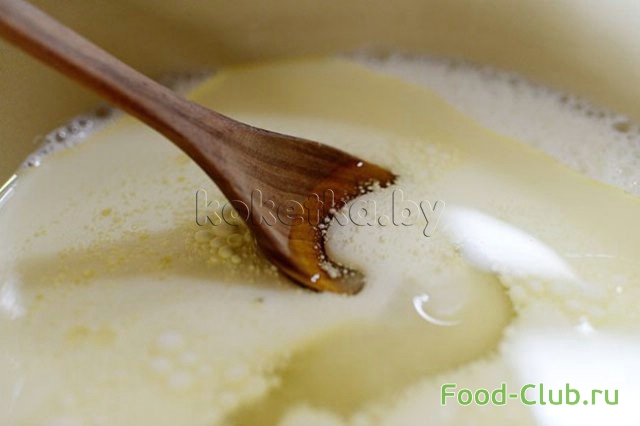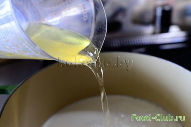 1. Приготовим тесто, для этого перемешиваем молоко, растительное масло и половину стакана сахара в большой кастрюле.