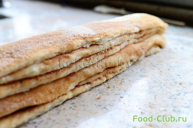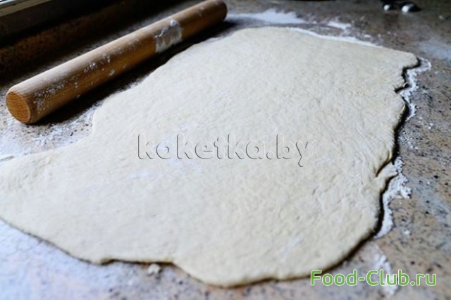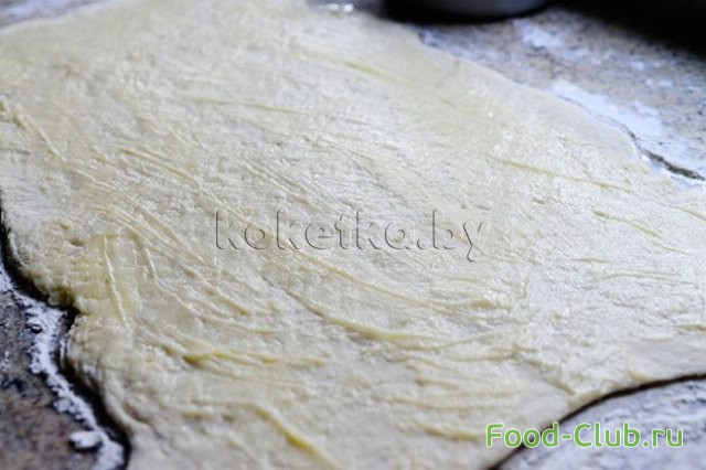 9. Охлажденное тесто раскатываем в пласт на просыпанной мукой рабочей поверхности.