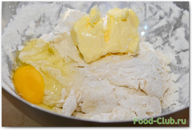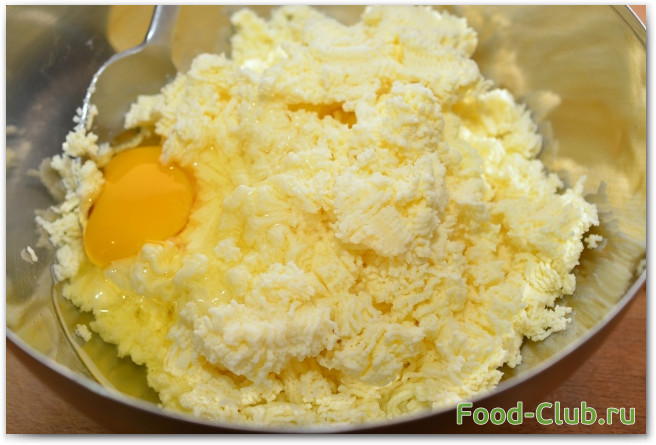 5. В это время готовим начинку. Творог протираем через сито, добавляем яйцо и хорошо перемешиваем.