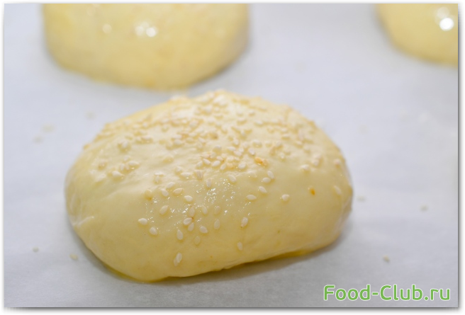 13. Руками формируем пирожки и выкладываем их на противень, засланный пергаментной, бумагой швом вниз. Даем постоять 20 минут, затем смазываем пирожки смесью из яйца и сливок и по желанию посыпаем кунжутом.