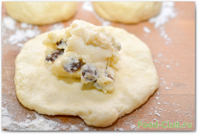 12. Каждый шарик раскатываем в лепешку, в центр лепешки выкладываем начинку.