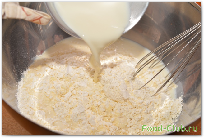 2. Перемешиваем половину муки с теплым молоком, добавляем опару.