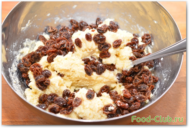 7. В кипятке на 5 минут замачиваем изюм, затем воду сливаем, изюм слегка обсушиваем и добавляем к творогу. Все хорошо перемешиваем. Начинка готова.
