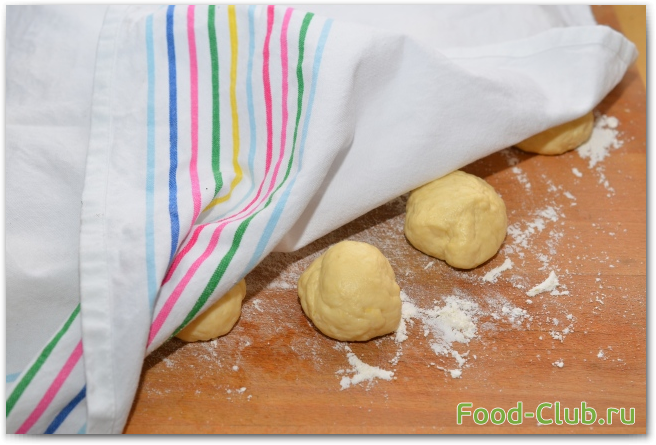11. Получившееся тесто делим на 20 равных частей и скатываем их в шарики. Выкладываем шарики на просыпанную мукой рабочую поверхность, накрываем полотенцем и оставляем на 10 минут, для поднятия.