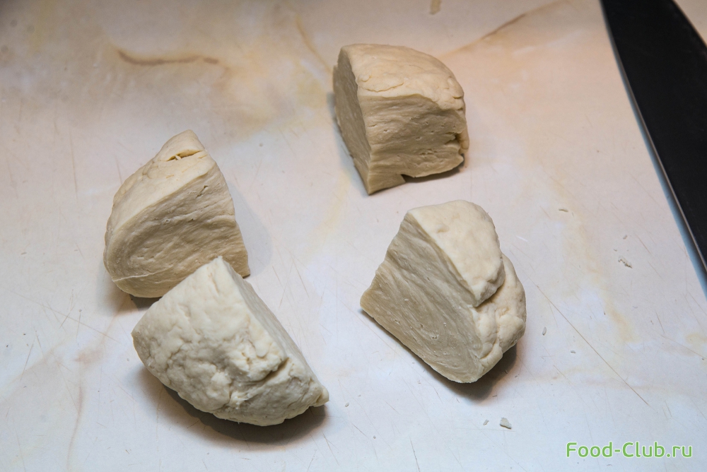 2. Разделите тесто на 4 части и раскатайте каждую часть в тонкий круглый пласт.