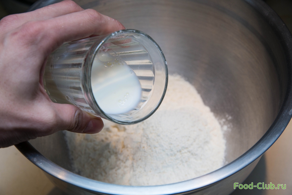 1. В большую миску насыпьте муку с солью, понемногу добавляя молоко, замешивайте тесто (около 2-3 минут).