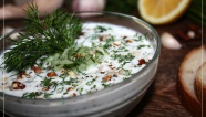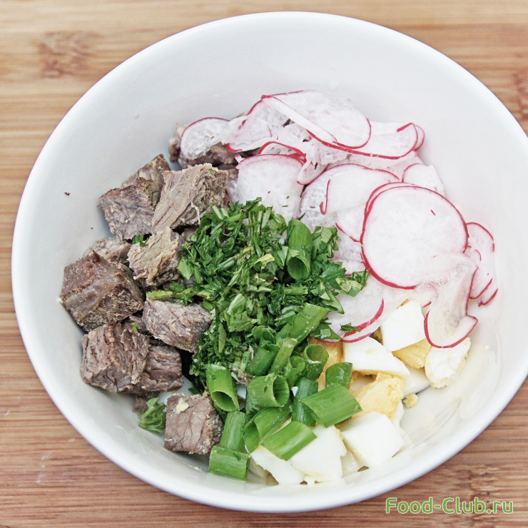 3. Редис порежьте на ломтики. Огурец порежьте на небольшие кусочки.