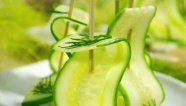 На масло кладем по небольшому кусочку буженины. Нарезаем огурцы вдоль, на длинные тонкие ломтики. Нанизываем на разноцветные пластмассовые шпажки маслины и кусочки огурца. Воткните шпажки в канапе.