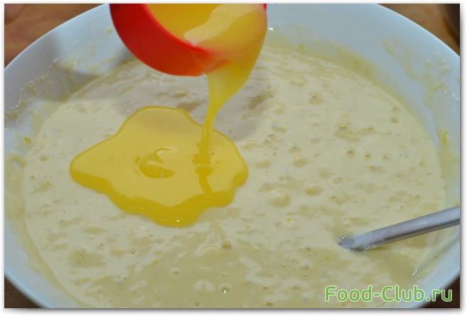 3. При постоянном помешивании добавляем к массе сыпучие ингредиенты, перемешиваем до однородности. Добавляем масло, хорошо, но не слишком долго перемешиваем тесто ложкой.