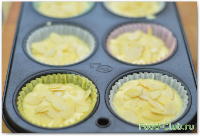4. На 2/3 части наполняем формочки тестом, посыпаем миндальными лепестками и слегка вдавливаем их в тесто. Ставим форму в предварительно разогретую духовку на 25 минут.