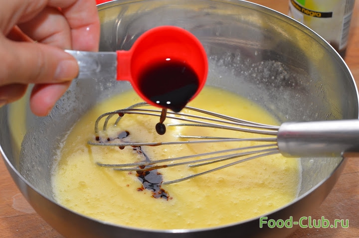 1. Сначала разогрейте духовку. Бананы тщательно разомните в однородное пюре и уберите в сторону. Растопленное масло, яйца и сахар смешайте в отдельной емкости до однородной массы. Добавьте ванильную эссенцию и снова тщательно перемешайте.