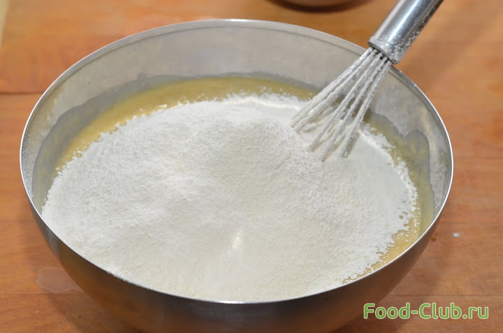 2. Теперь добавьте в тесто бананы и йогурт, снова перемешайте. Смешайте муку с разрыхлителем и аккуратно добавьте ее в будущее тесто. Теперь замесите, чтобы тесто получилось не густым.
