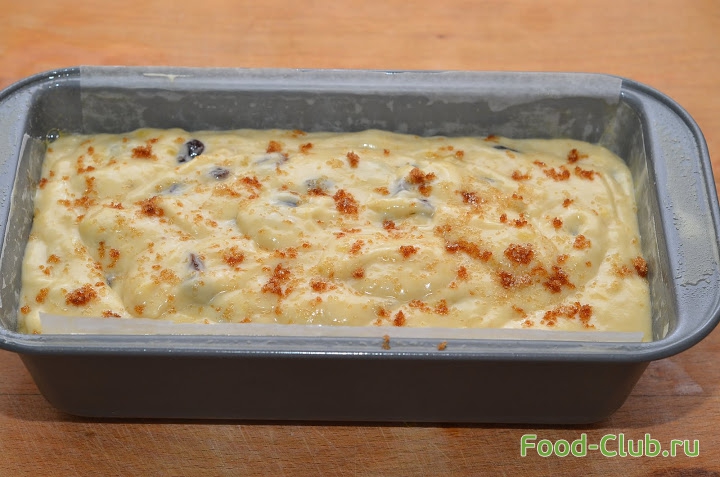 4. Теперь смазываем форму маслом и выстилаем ее пекарской бумагой. Аккуратно влейте тесто в форму для выпечки. Если вы хотите, чтобы кекс покрылся красивой румяной корочкой- присыпьте его немного коричневым сахаром.