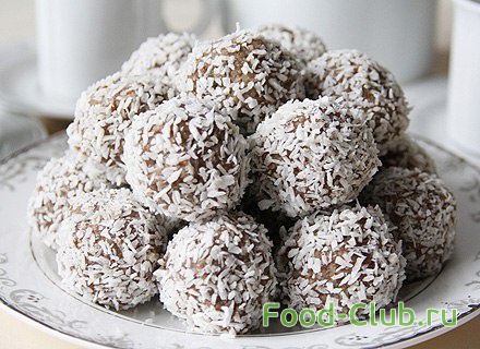 3. Теперь скатываем шарики, размером примерно как грецкий орех. Обваливаем шарики в кокосовой стружке и убираем в холодильник на 1.5 часа.