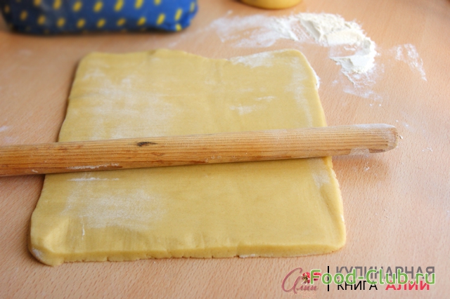 2. Теперь раскатайте из теста пласт толщиной примерно 8 мм. Разогрейте духовку и выстелите противень пергаментом. Аккуратно накрутите тесто на скалку и перенесите его на противень. Запекайте до легкого зарумянивания, минут 8-15, зависит от духовки.