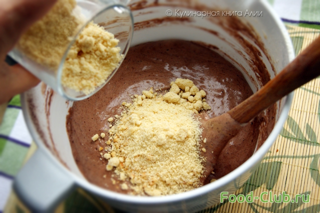 Яйца и сахар хорошенько взбейте миксером, около 10 минут. Во взбитые яйца просейте муку с разрыхлителем и какао. Аккуратно перемешайте до однородности. Добавьте молотый миндаль и шоколадную массу. Тщательно перемешайте все до получения однородной массы. -