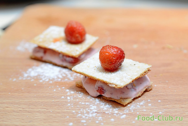 На нижний коржик положите взбитые сливки, сверху накройте вторым кусочком. Сверху посыпьте сахарной пудрой.