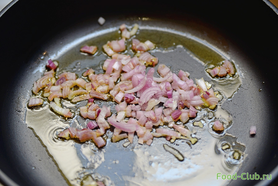 2. Лук мелко порежьте и обжарьте на сковороде/кастрюле со сливочным маслом на умеренно слабом огне в течении 4 минут.