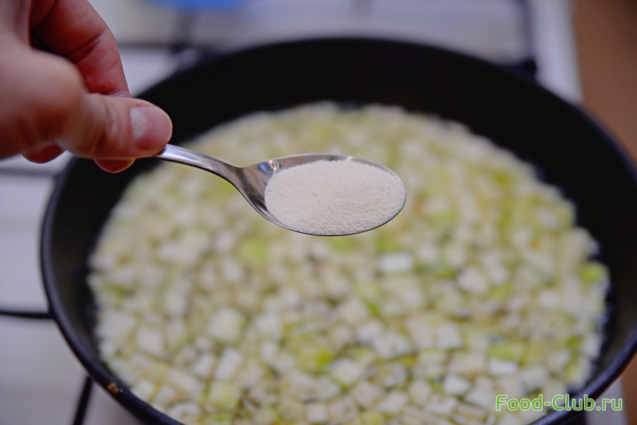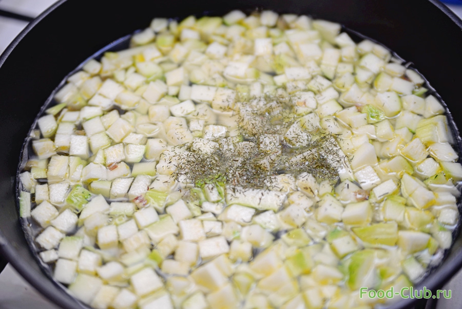 3. Добавьте цукини в сковороду к луку. Залейте также бульон, уксус и сушеный укроп.