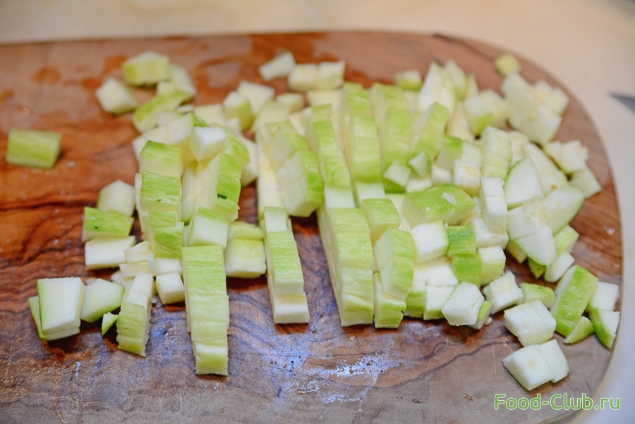 1. Цукини очистите теркой от кожуры (слегка потрите, чтобы снять верхнюю жесткую кожицу) и нарежьте на средние кусочки.