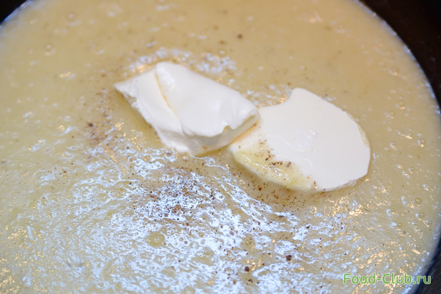 6. Налейте обратно в сковороду/кастрюлю, доведите до кипения и добавьте сметану, перемешайте, посолите, поперчите и подавайте к столу.