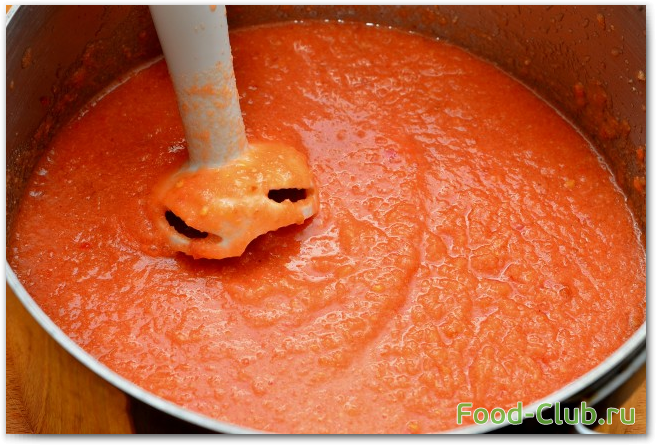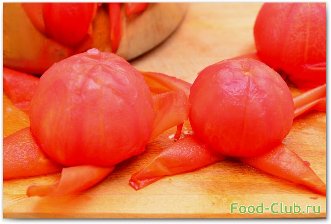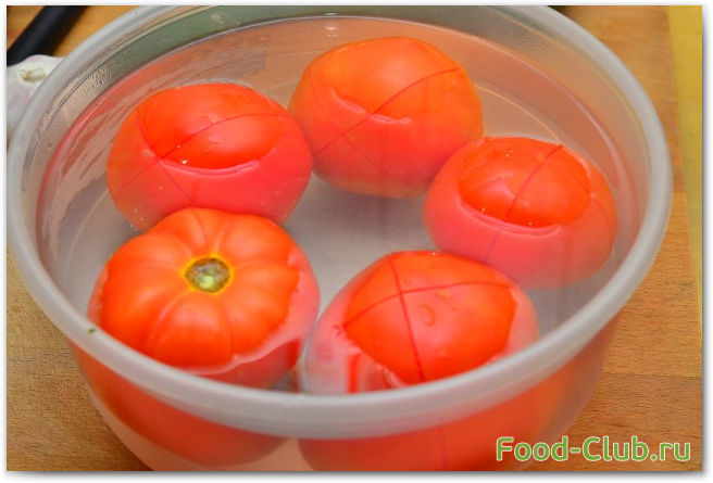 1. Помидоры чистим от кожуры, для этого острым ножом делаем крестообразный надрез на томатах и заливаем их кипятком на несколько минут.