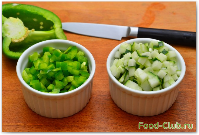 8. Для гарнира мелко нарезаем огурец и зеленый сладкий перчик.