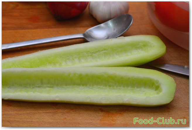 3. Огурцы чистим от кожуры, косточки удаляем столовой ложкой.