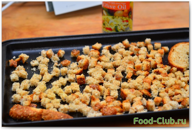 7. В это время нарезаем квадратиками хлеб и отправляем в духовку подсушиваться примерно на полчаса. Вначале сильно разогреваем духовку, а когда ставим сухарики, сбавляем огонь до минимума.