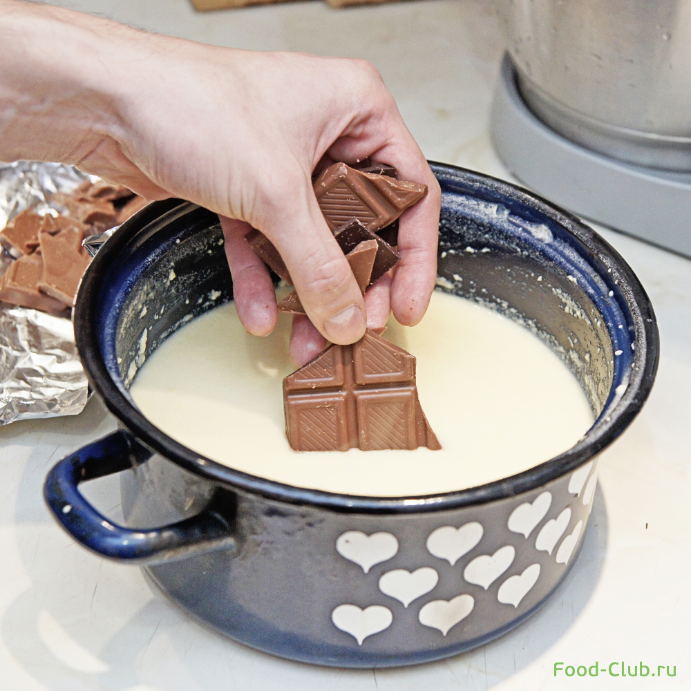4. Шоколад поломайте на небольшие кусочки и добавьте в общую массу. Хорошо перемешайте, чтобы шоколад растопился.