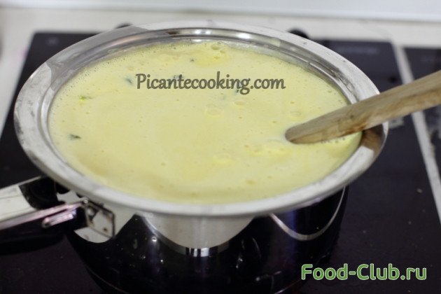 3. Массу переливаем в кастрюлю и ставим на малый огонь. При постоянном помешивании варим массу до состояния соуса. Как можно быстрее остужаем молочную смесь, затем кастрюлю накрываем крышкой и ставим в холодильник на 12 часов.