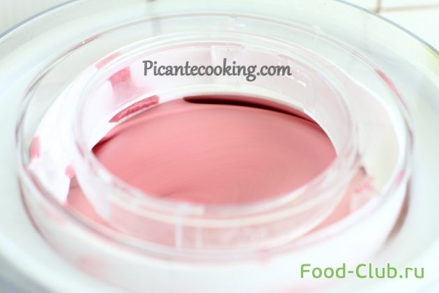 6. Перекладываем массу в мороженицу и замораживаем содержимое до полумягкого состояния. Затем перекладываем мороженое в посуду с крышкой и окончательно замораживаем в морозилке (это займет пару часов).