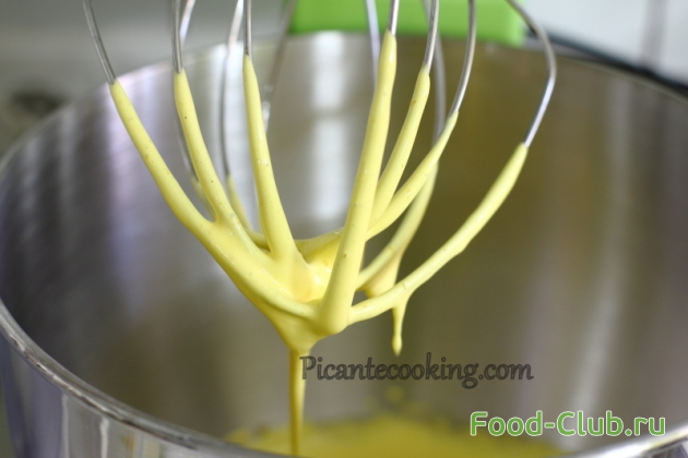 2. Взбиваем желтки с сахаром добела. Продолжая взбивать, тонкой струйкой вливаем молочную смесь, и продолжаем перемешивать еще минуту.