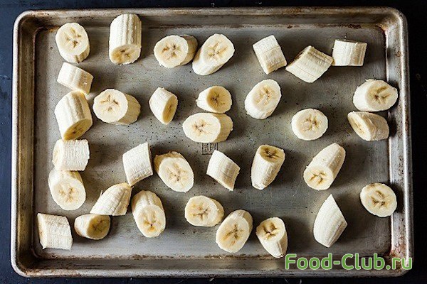 Бананы очистите от кожуры, нарежьте на небольшие кусочки и выложите на блюдо. Поставьте в морозильник на 2 часа.