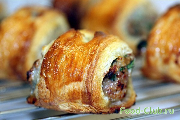 3. Тесто раскатываем на полоски шириной примерно 15 см (если тесто раскатанное, то просто нарезаем прямоугольники). Длина прямоугольника должна быть равна длине раскатанной колбаски. На каждый пласт теста укладываем колбаску. Края пласта смазываем взбитым яйцом и заворачиваем рулет, швом вниз.