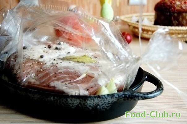 2. Приготавливаем смесь из измельченного лаврового листа, молотого черного перца, соли, тимьяна и пропущенного через пресс чеснока. Все хорошо перемешиваем, натираем смесью мясо, заворачиваем его в пищевую пленку и укладываем в холодильник на ночь.