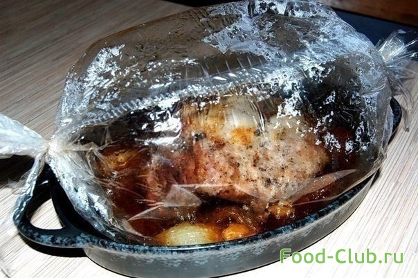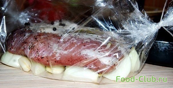3. Наутро в рукав укладываем порезанный на крупные куски лук, целые зубчики чеснока, сверху выкладываем мясо, пару горошин душистого перца и лавровый лист.