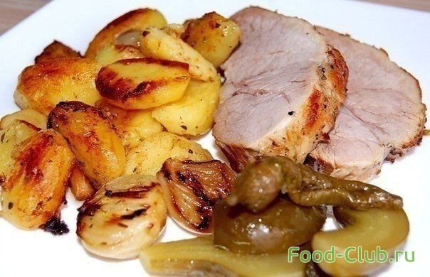 5. По истечению времени, достаем противень с мясо, разрезаем рукав и перекладываем его содержимое на противень к печеному картофелю. Помещаем блюдо в духовку при температуре 200 градусов на 10 минут, до образования красивой корочки.