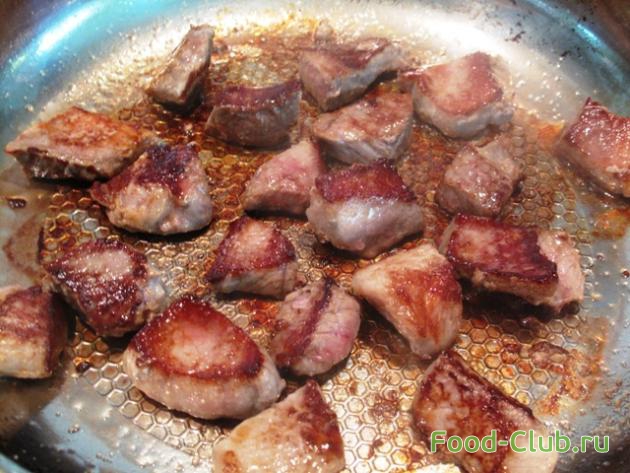 4. Мясо нарезаем на небольшие кубики, солим и перчим по вкусу и обжариваем до готовности на жире или растительном масле. Колбасу режем на кусочки, которые будет удобно накалывать и обжариваем на сухой сковороде.