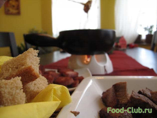 5. Подавать фондю хорошо на настольном подогревателе, мясо, колбасу и хлеб выкладываем вокруг на тарелках.