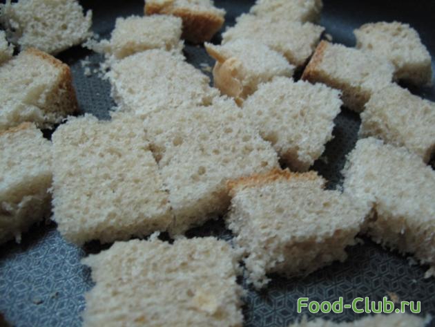 3. Нарезаем батон крупными кубиками, выкладываем в один слой на противне и подсушиваем в предварительно разогретой духовке 5 минут. Булочки должны быть хрустящими, но мягкими внутри.