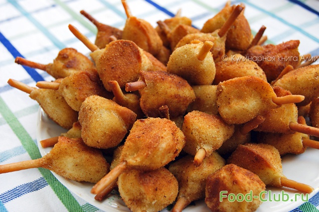 4. Разогрейте сковородку с маслом на слабом огне. Каждую "ножку" обмакните в яйцо, а потом в сухари. Обжаривайте на сковородке до румяной корочки с двух сторон, а готовые "ножки" выкладывайте на бумажные полотенца, чтобы удалить лишний жир.